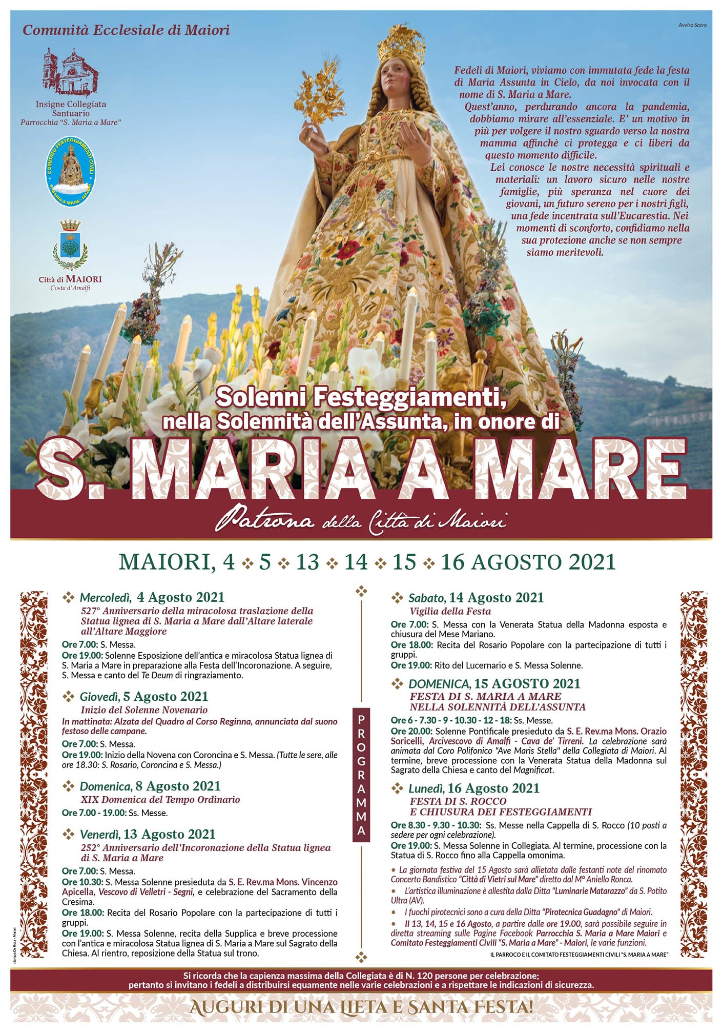 Anche quest’anno i Solenni Festeggiamenti Patronali saranno molto diversi nella forma rispetto a come siamo abituati a causa della pandemia da Covid, ma immutati nell’animo dei maioresi pronti ad onorare la Santa Patrona.