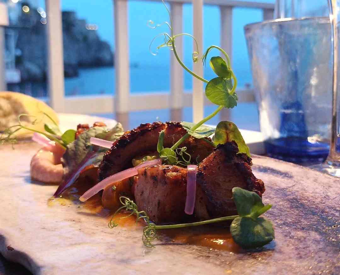 A dare il benvenuto la creatività di Grazia negli antipasti, con la ricciola nelle sembianze del pastrami: un omaggio alla platea a stelle e strisce nel solco della tradizione costierana. E al contempo, anche allo status symbol dell’italianità per eccellenza, il tricolore di salsa al pomodoro e basilico. Si esce un po’ fuori dai confini con l’astice alla catalana, ma ecco che si ritorna subito in patria con il guazzetto di pomodorini gialli e rossi ed il caviale al limoncello che lo accompagna. E’ un inno alla tradizione del territorio il polpo in doppia cottura lessato e scottato, con gazpacho di peperoni e cipolla e burrata di bufala.