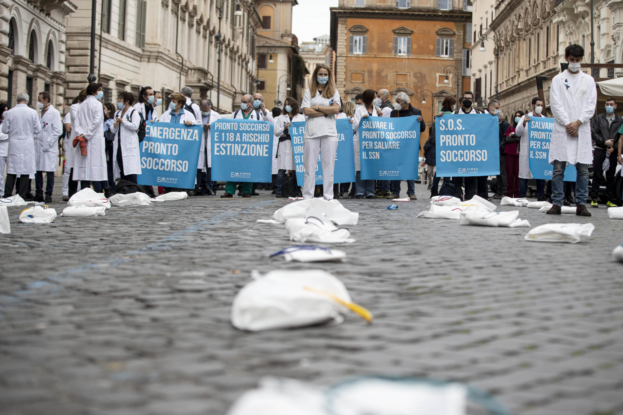 Medici e infermieri di pronto soccorso in piazza al centro di Roma. La manifestazione, è stata organizzata dalla Simeu (Società italiana medicina di emergenza-urgenza) a piazza Santi Apostoli. “Salvare la medicina d’emergenza-urgenza significa salvare l’intero Ssn” scrive la Simeu sul suo sito lanciando l’iniziativa.