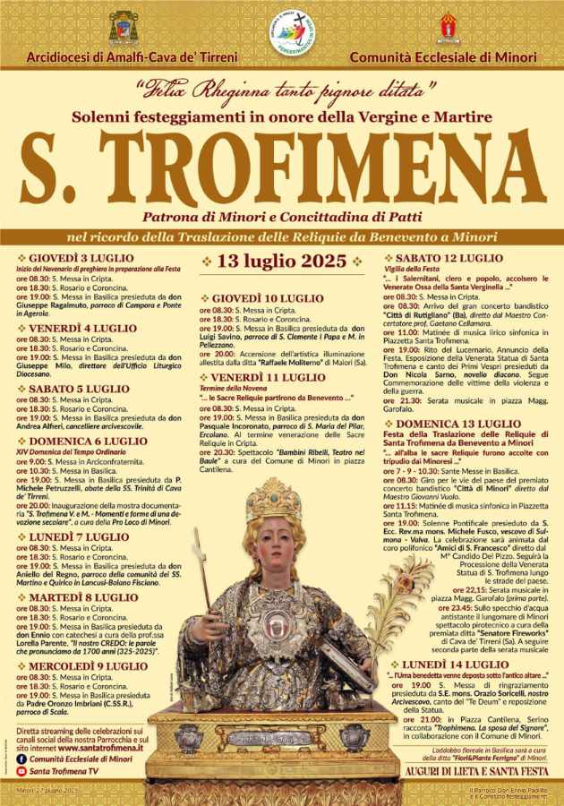 I solenni festeggiamenti in onore di Santa Trofimena, patrona di Minori, entrano nel vivo in questi giorni con le celebrazioni centrali in programma oggi, 13 luglio 2025, e domani, 14 luglio. Si tratta della festa della Traslazione delle Reliquie, che ricorda il ritorno da Benevento a Minori della Santa Vergine e Martire, figura amatissima dalla comunità locale.