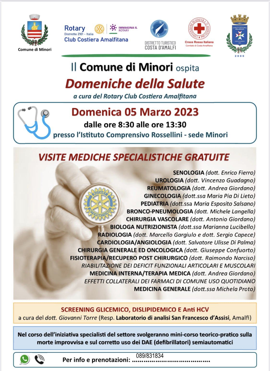 Tornano a svolgersi, a Minori, le domeniche della salute. Il consueto appuntamento della manifestazione finalizzata alla prevenzione ed alla promozione di stili di vita salutari è previsto in programma domenica 5 Marzo, a partire dalle 8:30 e fino alle 13.30, all’interno dell’Istituto Comprensivo Rossellini.