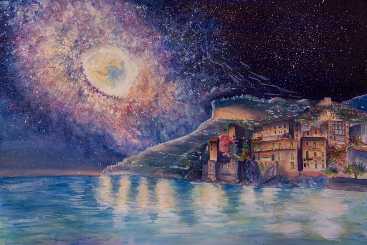 “Questa opera pittorica è simbolo della rinascita dell’uomo (raffigurato come un pianeta terra) dopo l’incubo pandemico, con lo sfondo di Minori e del nostro paesaggio costaiolo.”
