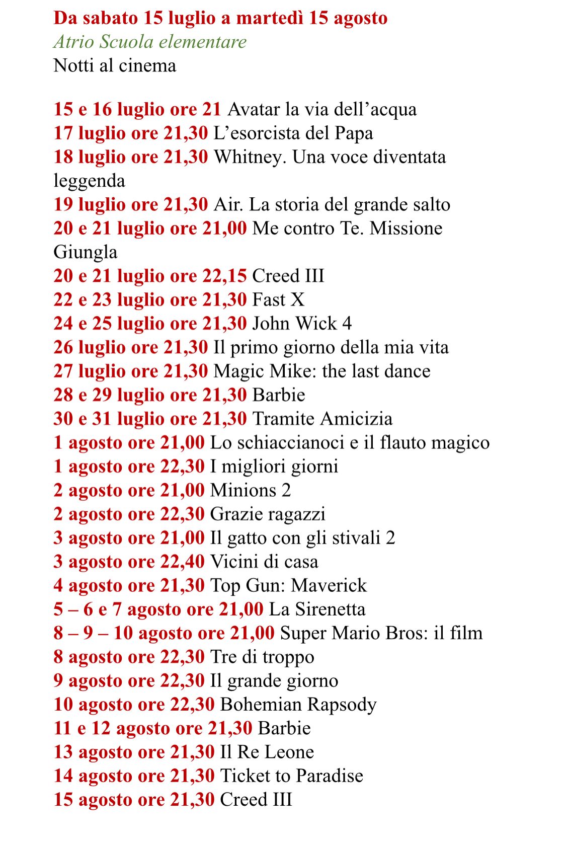 Le proiezioni si terranno tutte le sere: ad agosto saranno anche particolarmente potenziate, spaziando su tutti i generi, dai colossal ai film drammatici a quelli di animazione.