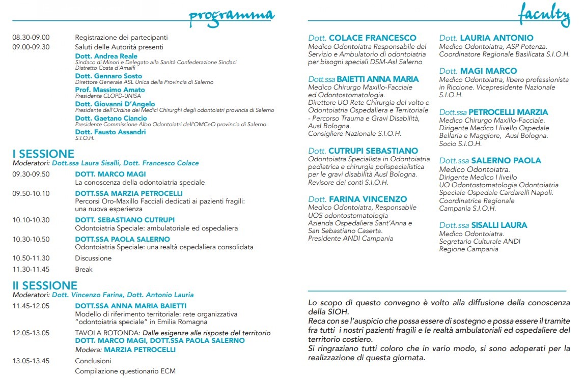 Si terrà a Minori sabato 15 aprile, presso la Sala Consiliare, il primo Convegno Regionale Sioh (Società Italiana di odontostomatologia per l’handicap) della Costiera Amalfitana. L’evento è organizzato dalla dottoressa Marzia Petrocelli, chirurgo maxillo-facciale strutturata presso Ospedale Bellaria e Ospedale Maggiore di Bologna, originaria della Costiera Amalfitana.