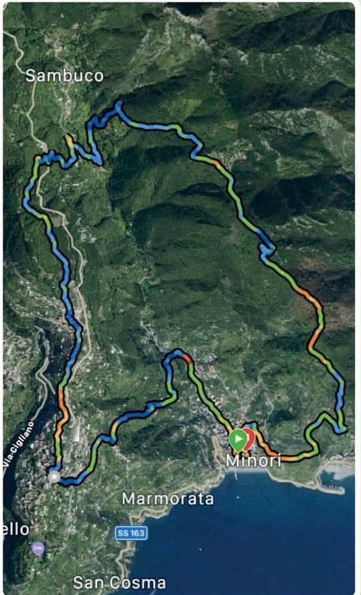 A questo punto, dopo un corsa in discesa di circa 1 Km attraverso un castagneto, si arriva ad una scala ripida che conduce al celebre “Sentiero dei Limoni”, storico sentiero che collega Maiori a Minori. Si tratta del percorso delle “formichelle”, le donne locali che negli anni addietro trasportavano ceste di limoni sulla testa per essere commerciati sulla costa.