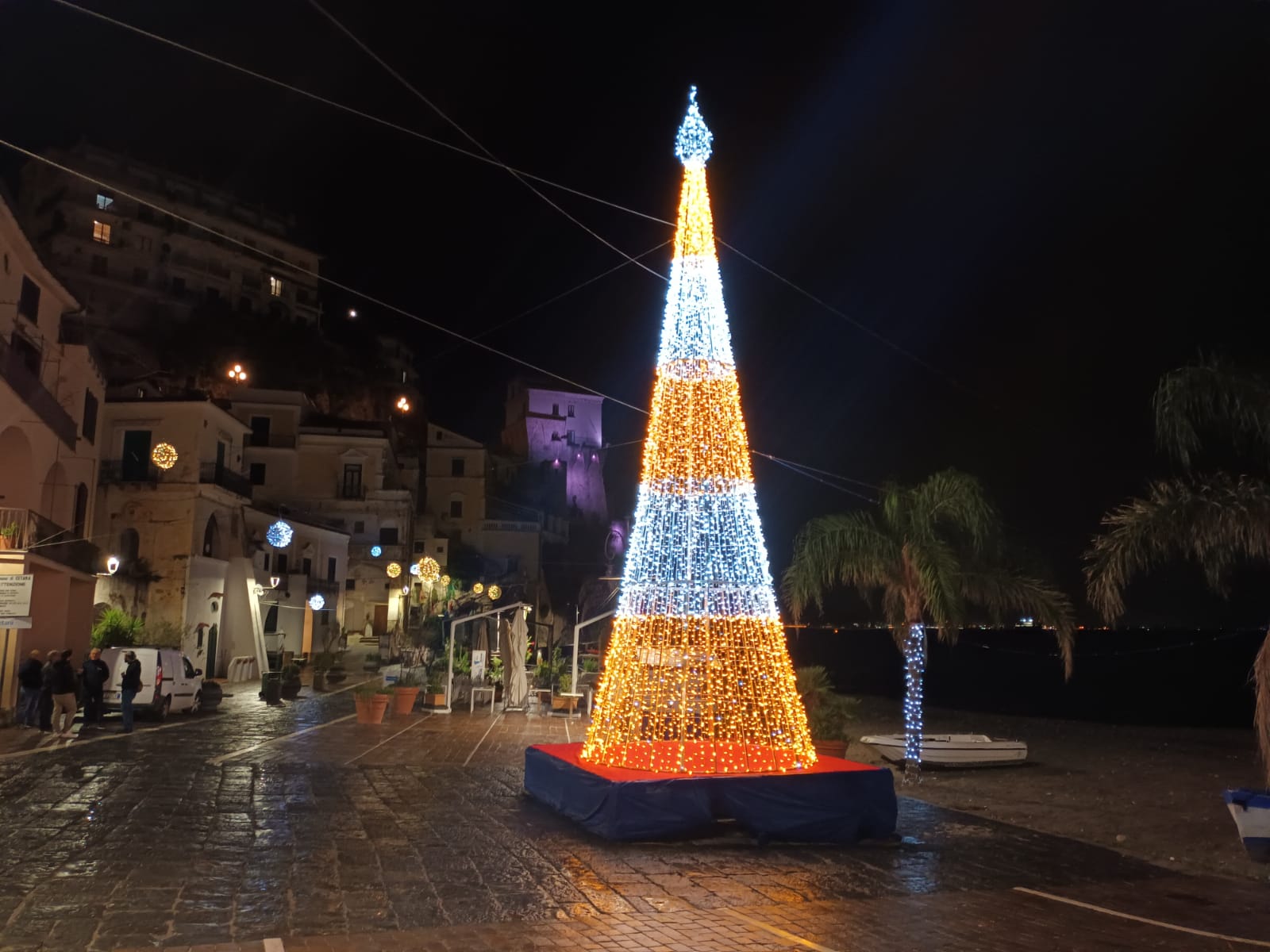 Un albero di Natale campeggia, dunque, già acceso al di sotto della Torre Vicereale, racchiusa idealmente in un quadro luminoso a forma di pacco regalo, già preso d’assalto dai turisti presenti ed anche dai cittadini cetaresi per i primi scatti a tema.