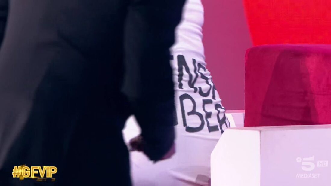 Sonia Bruganelli nella finale del Grande Fratello Vip ha indossato una mantellina di colore bianco sulla quale campeggiava la scritta “Pensati Libera“.