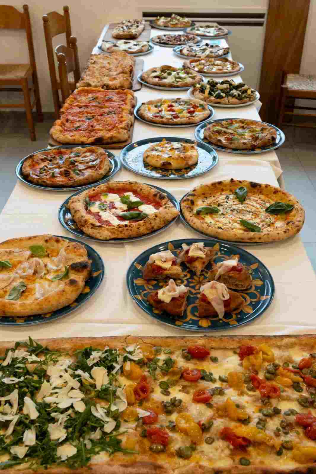 “Pizza Graziano”: Pizza a metro due gusti – Fave, pancetta, cipolle, pomodorini gialli, pomodorini rossi, provola e Fior di Latte/ Provola, Fior di Latte, rucola, finocchietto selvatico, scaglie di pecorino e limone grattugiato.