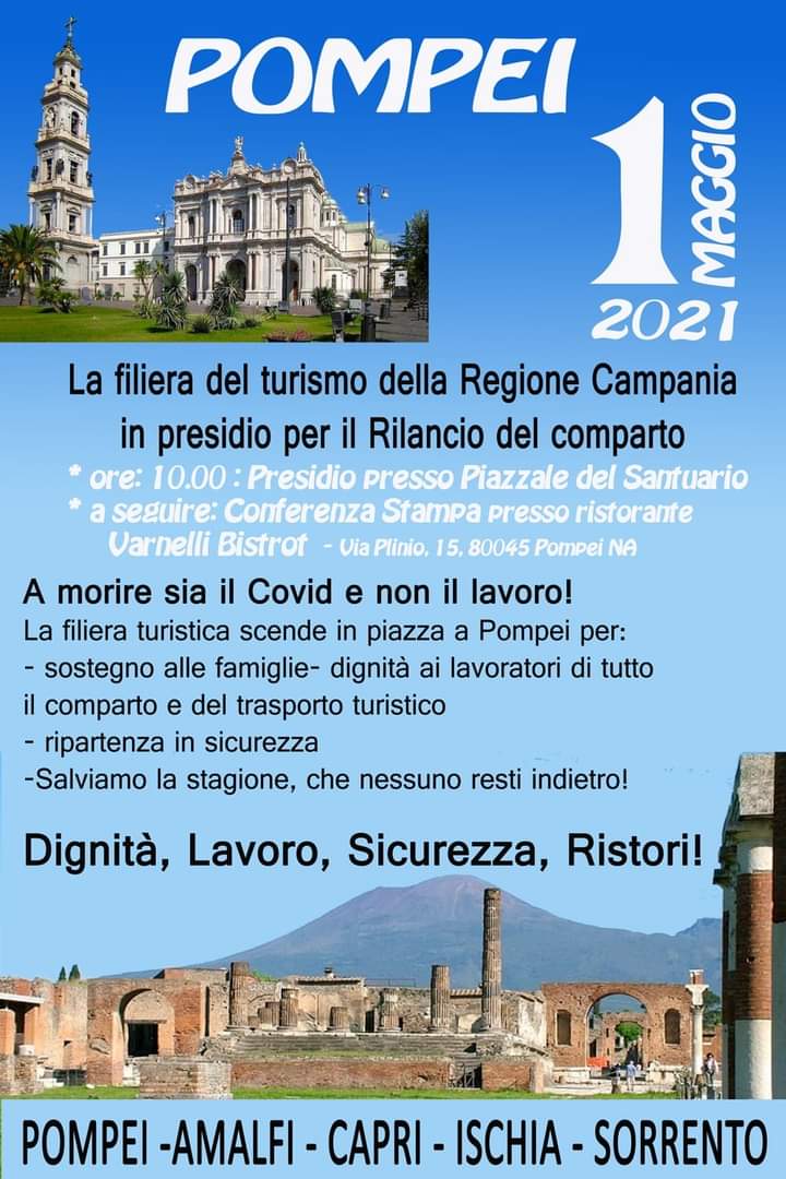 Sabato 1 maggio a Pompei, a Piazza del Santuario, a partire dalle ore 10.00, si terra un presidio della filiera del Turismo della Regione Campania per il rilancio del turismo, della filiera e del trasporto.