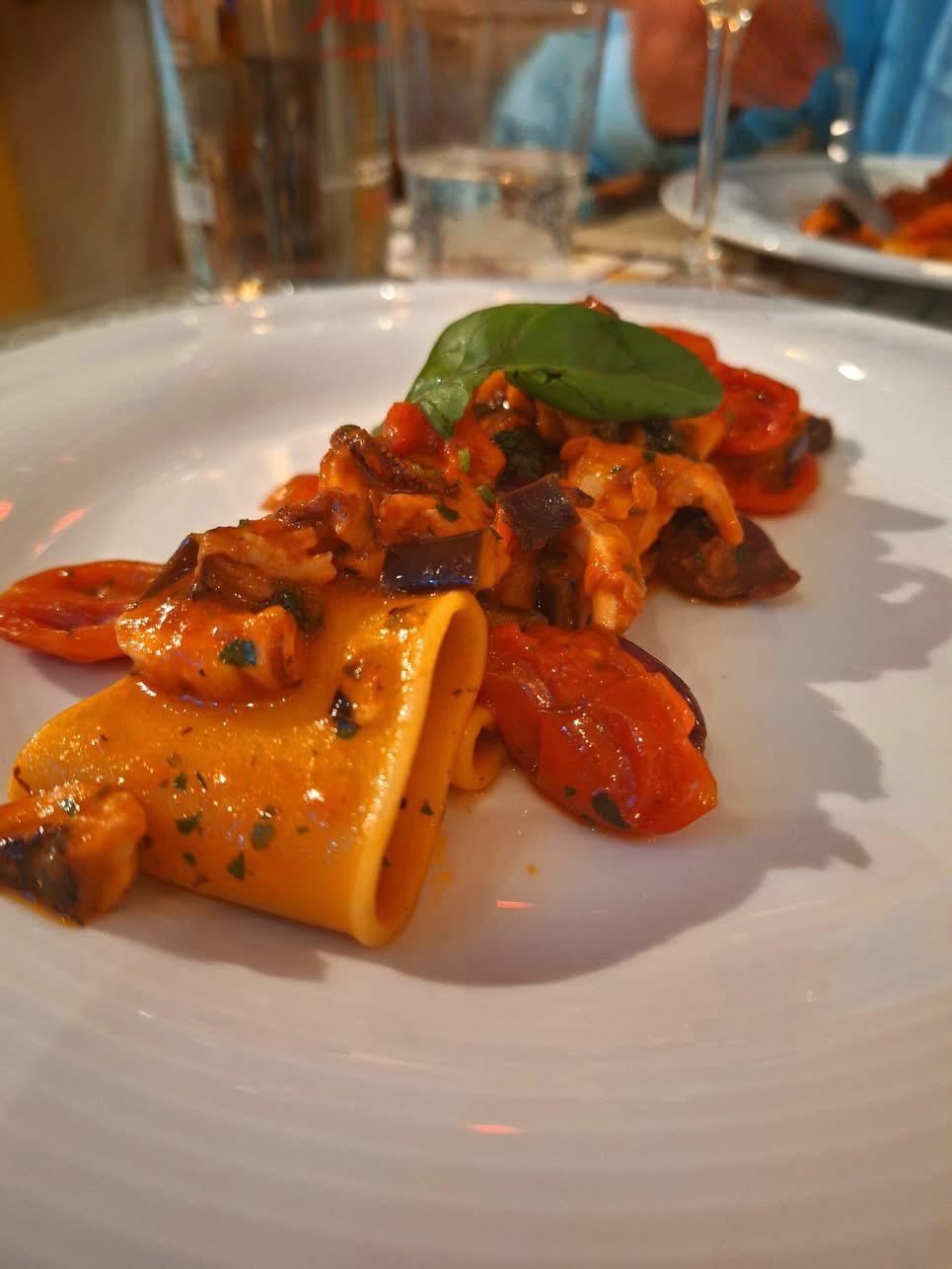 I primi piatti, essenza del menù, hanno un’anima maggiormente tradizionale: ed ecco che al risotto allo scoglio si affiancano i naccheri con zucchine, cozze e gamberetti, il raviolo caprese e burrata. Nel solco della filosofia culinaria della Divina, ad esprimere al meglio quella simbiosi dei prodotti dell’orto con quelli delle lampare, ecco che trovano spazio anche gli gnocchi con polpo, melanzane ed olive nere.