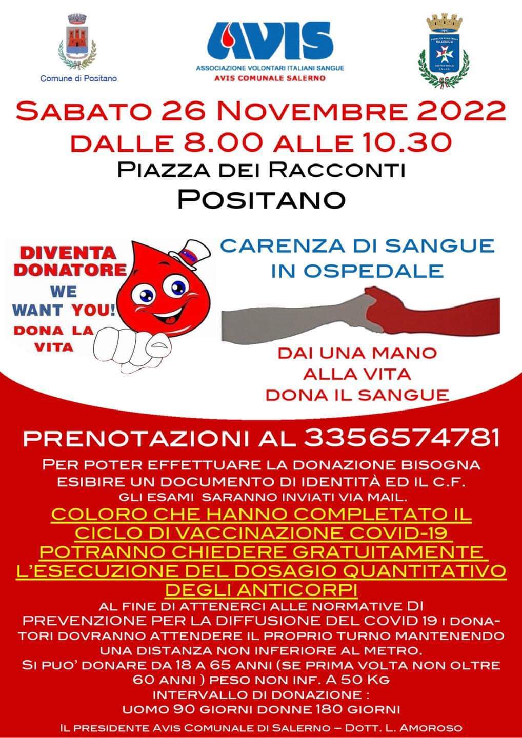 Per questo motivo i volontari dell’Avis confidano nel supporto e nella partecipazione della popolazione residente a Positano e, più in generale, di chiunque abbia un’età compresa tra i 18 ed i 65 anni e voglia contribuire alla campagna.