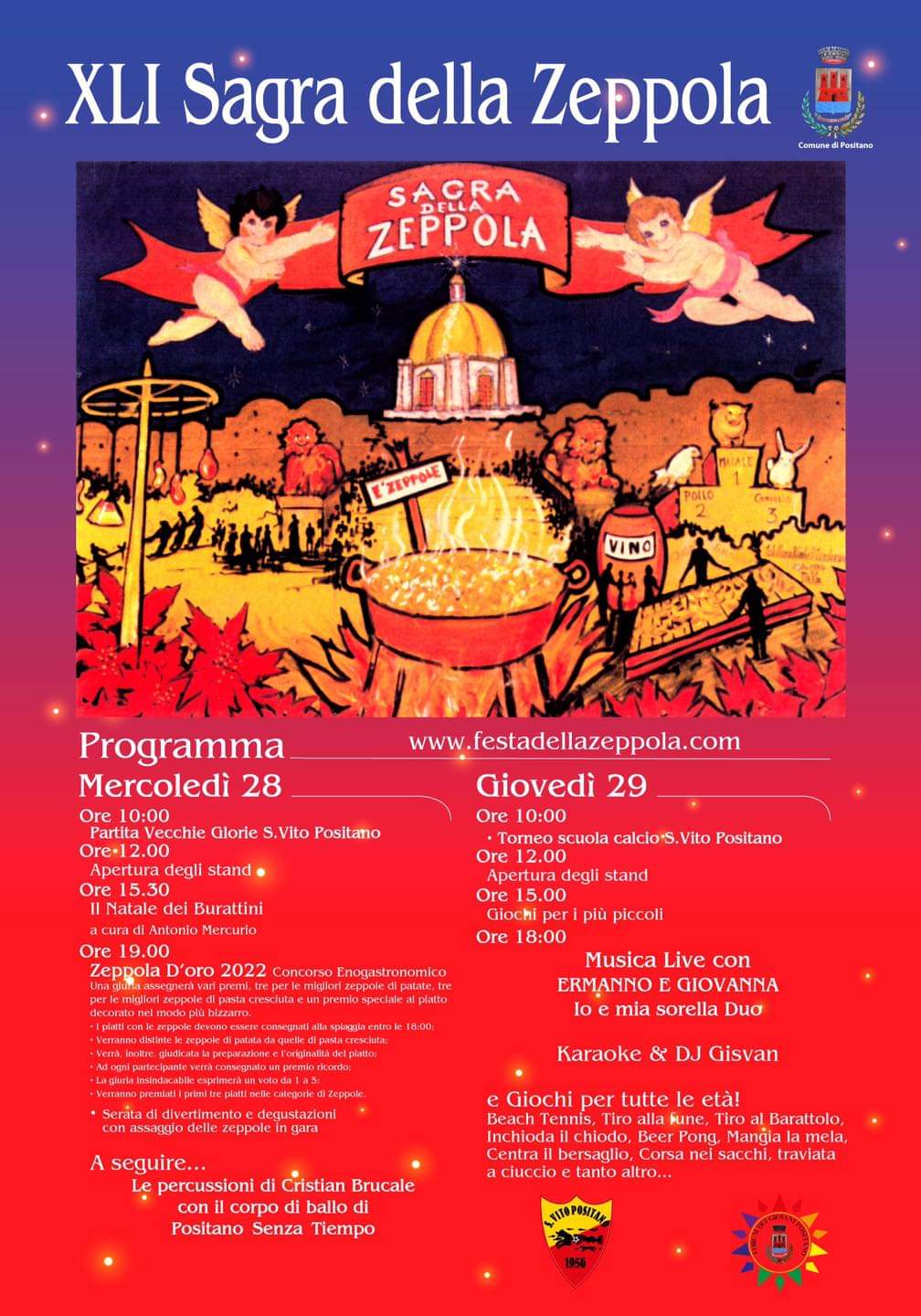 Prima della gara delle zeppole, in mattinata, alle 10 si terrà una partita delle “vecchie glorie” San Vito di Positano, alle 12.30 l’apertura degli stands ed alle 15 il Natale dei Burattini a cura di Antonio Mercurio