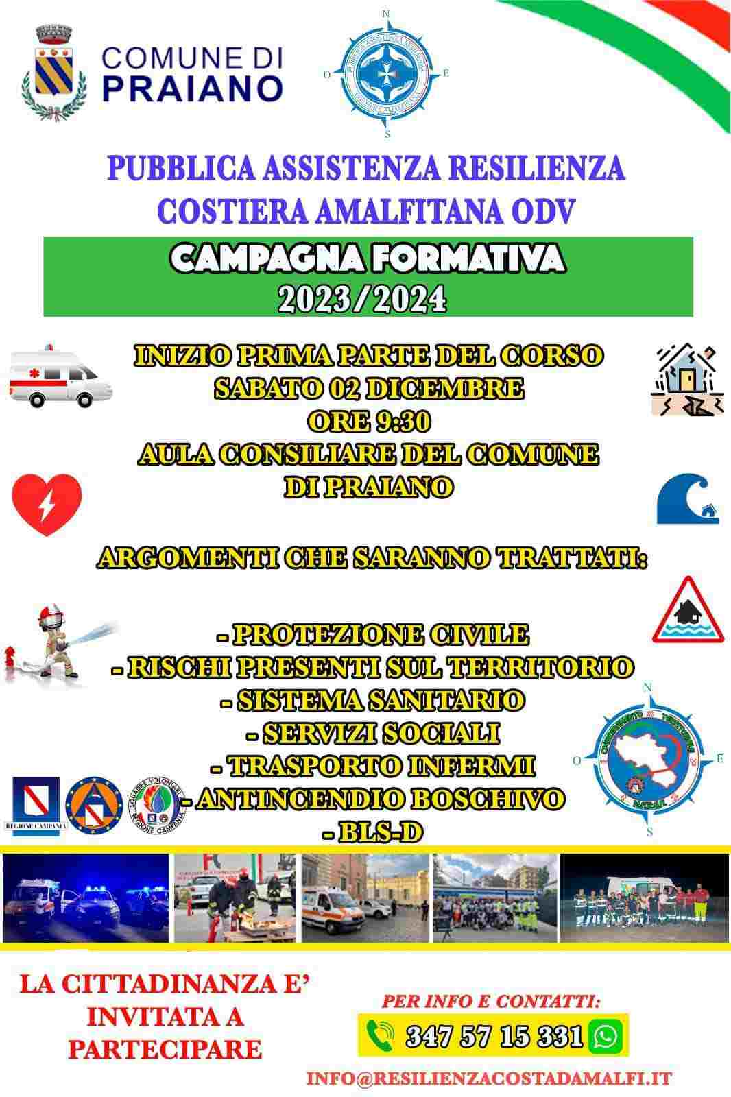 Il Comune di Praiano, unitamente alla Pubblica Assistenza Resilienza Costiera Amalfitana Odv (nucleo di riferimento comunale di Protezione Civile) promuove, a partire da sabato 2 dicembre, un ciclo di momenti di aggiornamento, informazione e formazione aperti a tutta la cittadinanza e a tutti i volontari.