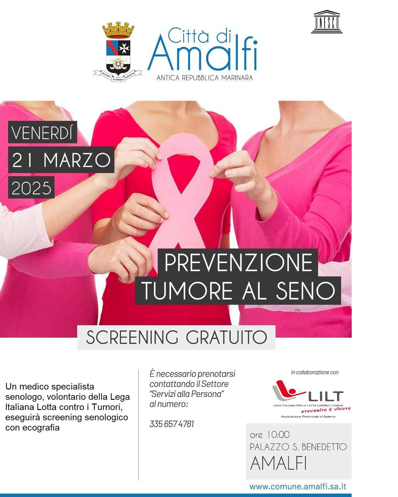 PRENOTAZIONI: L’appuntamento è per venerdì 21 marzo 2025 alle ore 10 presso Palazzo San Benedetto, sede del Comune di Amalfi. Per partecipare agli screening è necessario prenotarsi all’Ufficio Servizi alla Persona del Comune di Amalfi, contattando i numeri 089 87 36 222 – 089 8736217 in orario mattutino.