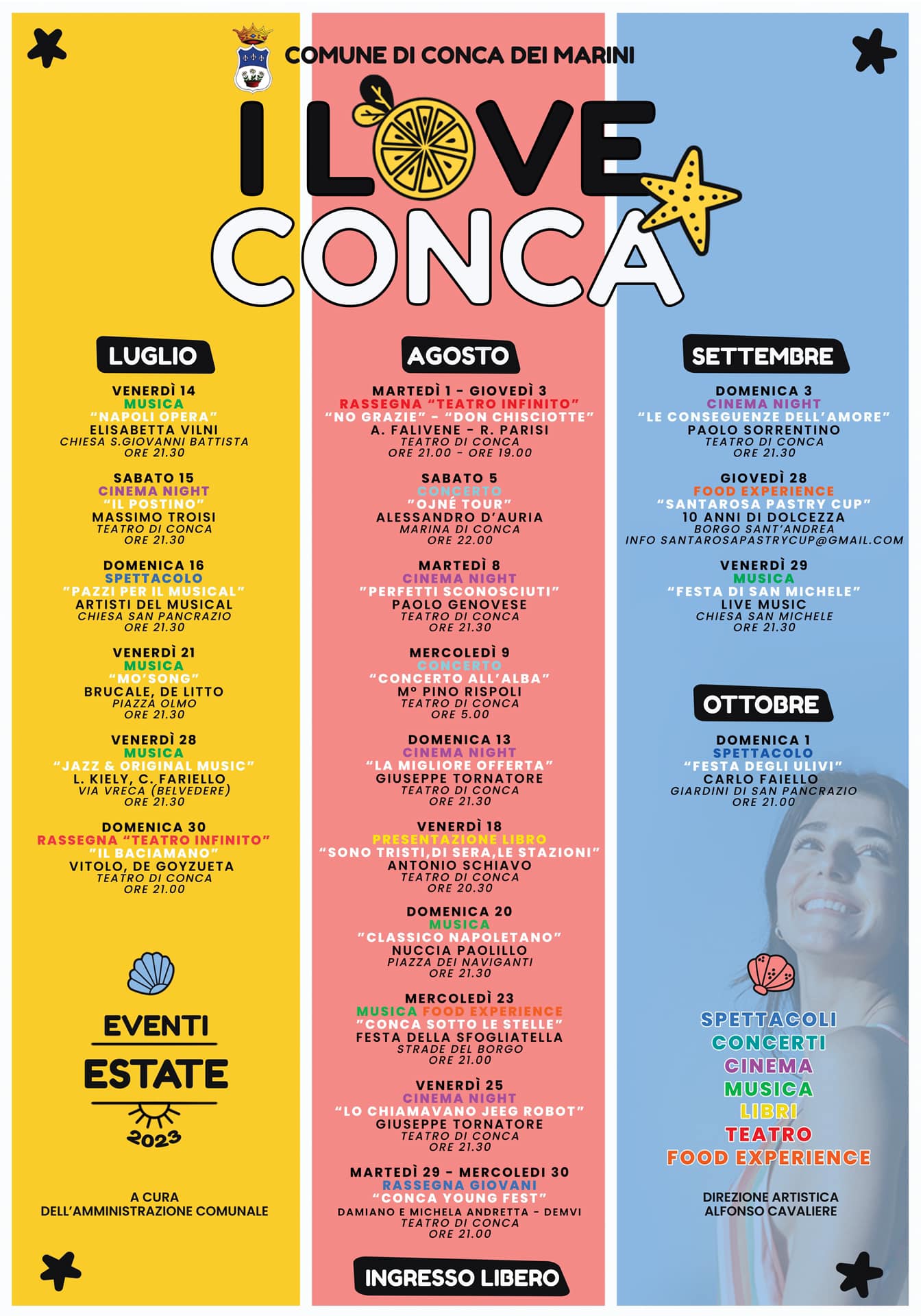 «Il programma di quest’anno è molto articolato, e prevede concerti nelle più belle piazzette del paese, una rassegna teatrale con attori di rilevanza nazionale come Annarita Vitolo e Adriano Falivene, una rassegna cinematografica e delle serate di spettacolo organizzate dai giovani di Conca. In più ci saranno alcuni appuntamenti tradizionali come la Festa della Madonna della Neve, animata dalla musica di Alessandro D’Auria, il Concerto all’Alba, gli eventi gastronomici “Conca sotto le stelle”e “Santarosa Pastry Cup” e la “Festa degli Ulivi” curata dal Maestro Carlo Faiello», commenta il primo cittadino di Conca Dei Marini Pasquale Buonocore.