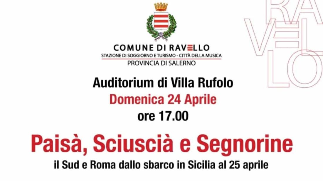 Mario Avagliano e Marco Palmieri danno appuntamento a Ravello. Domenica 24 aprile, nella splendida cornice di Villa Rufolo, la presentazione del volume “Paisà, sciuscià e segnorine. Il Sud e Roma dallo sbarco in Sicilia al 25 aprile”. Presenti anche il sindaco Paolo Vuilleumier e il delegato alla cultura Luigi Mansi.