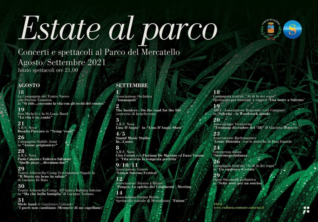 “Estate al Parco” è la rassegna promossa dal Comune di Salerno che, con il nuovo allestimento all’interno del più esteso polmone verde della città, ha voluto incrementare le strutture e le opportunità per lo svolgimento di spettacoli e manifestazioni nel corso della stagione estiva, con l’intento di offrire ad artisti, addetti ai lavori, organizzatori un aiuto concreto in questa fase storica di ripartenza dopo la pandemia Covid-19 che ha danneggiato in particolar modo l’attività artistica e culturale.