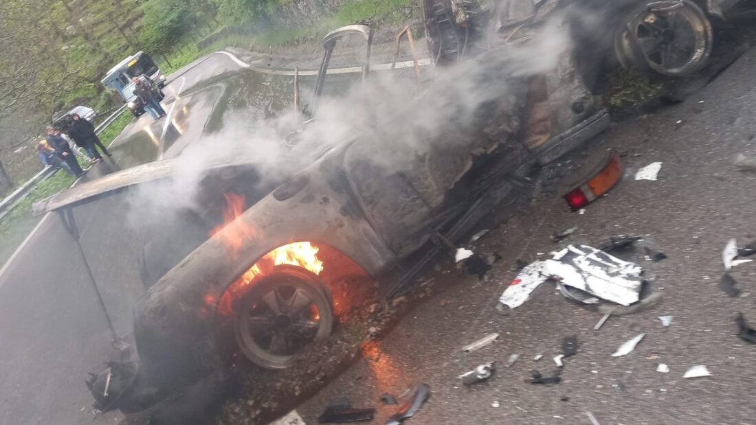 Auto in fiamme sul valico di Chiunzi. È accaduto poco dopo le 13, quando una vettura appartenente a una sigla storica – una Porsche – si è scontrata con un Ncc proveniente dal senso opposto di marcia.