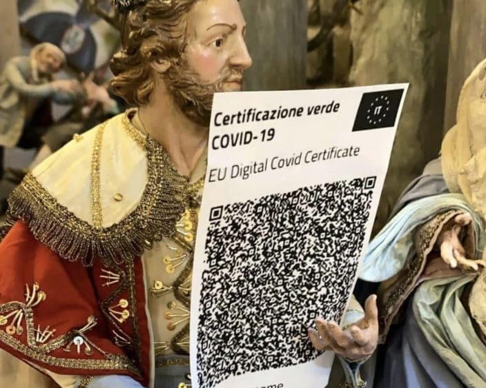 E invece l’originalità e la fantasia del maestro artigiano Marco Ferrigno ha messo il passaporto vaccinale nelle mani dei viaggiatori per eccellenza, ovvero i tre Re Magi.