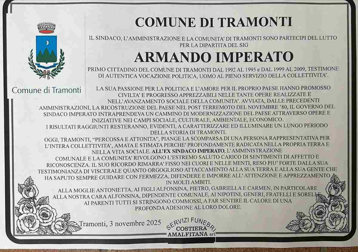 Profonda tristezza avvolge la comunità di Tramonti per la scomparsa di Armando Imperato, ex sindaco e figura di riferimento della vita amministrativa e sociale del paese. Aveva 77 anni ed è stato per lungo tempo protagonista della scena politica locale, guidando il Comune con dedizione e senso delle istituzioni.