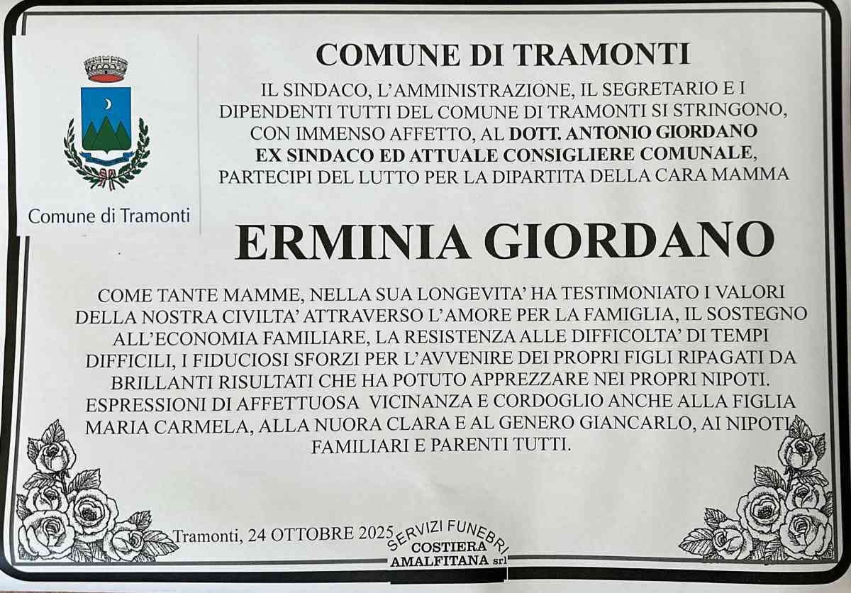 Il sindaco, l’amministrazione, il segretario e tutti i dipendenti del Comune di Tramonti hanno espresso profondo cordoglio, stringendosi con sincero affetto al dott. Antonio Giordano, già sindaco e attuale consigliere comunale, e a tutta la sua famiglia. Nel messaggio istituzionale viene sottolineato come Erminia, con il suo esempio di madre, abbia trasmesso i valori più preziosi della comunità: l’impegno domestico, l’amore per la famiglia, la capacità di affrontare periodi complessi con dignità e forza, trovando nel successo dei figli e dei nipoti il premio per tanti sacrifici.