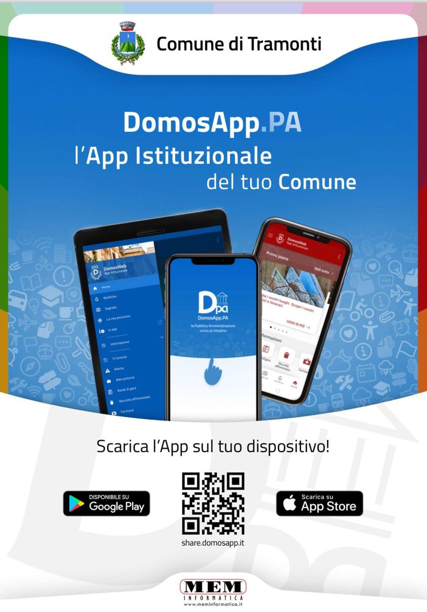 Alla presenza quotidiana sui social network del comune con le sue attività, si aggiungerà, infatti, la nuova app Istituzionale “DomosApp.PA”, per smartphone e tablet, completamente integrata con il sito web del Comune di Tramonti e rivolta, di riflesso, alla fruizione da parte dei cittadini e delle imprese del territorio.
