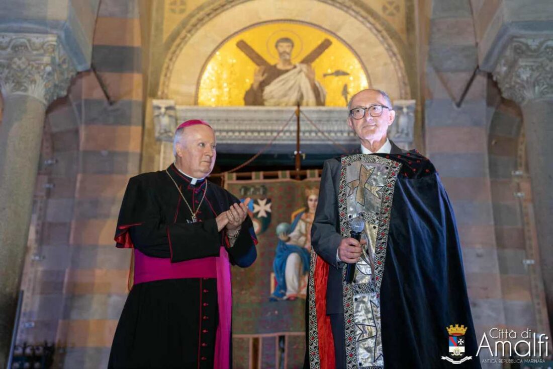Al termine della cerimonia di investitura, l’imponente corteo storico – composto da oltre 100 figuranti – ha fatto rientro da Atrani ad Amalfi, schierandosi al termine sulla monumentale scalea della Cattedrale di S. Andrea, dove si è tenuto il saluto del nuovo Magister alla sua Città.