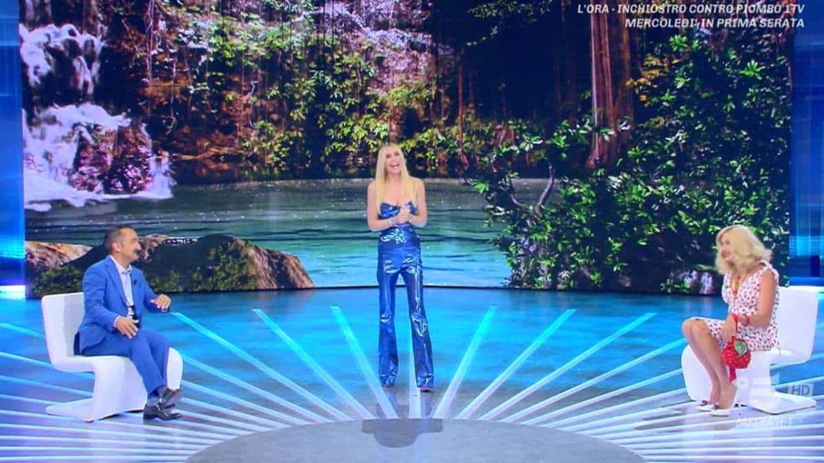 Un vestito talmente stretto che ha fatto persino fatica a camminare per raggiungere il centro dello studio. Ai piedi ha scelto un paio di sandali color oro, dal tacco vertiginoso e in abbinamento una collana dello stesso colore. Per la puntata del 13 giugno ha scelto una tuta di colore azzurro lucido che ha attirato l’attenzione del pubblico.