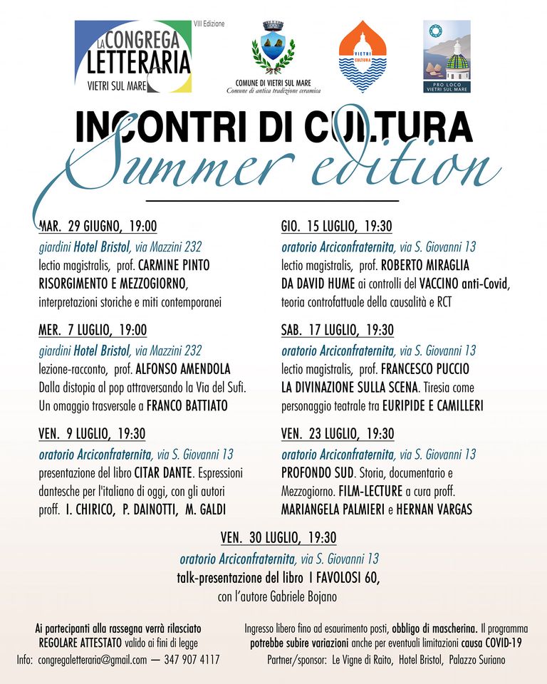 Gli Incontri di Cultura 2021 sono organizzati dalla Congrega Letteraria, in collaborazione con l’Assessorato alla Cultura Comune di Vietri sul Mare e la Proloco Vietri sul Mare.